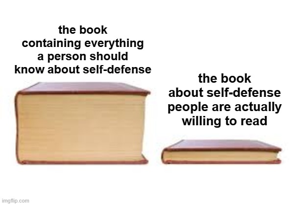 The truth is that most people’s motivation to learn about self-defense is not enough to overcome their feelings of immediate safety (perceived or actual), and writing that is gatekeeping, politically charged, or intimidating does nothing but reinforce that inertia. At the end of the day we can’t reach into hearts and minds to make people motivated, but we can try to build it up by appealing to positives like fun and feelings of confidence. A book may never be as accessible as a sub-10-minute YouTube video, but the less reading feels like pulling teeth, the more info will hopefully get through.