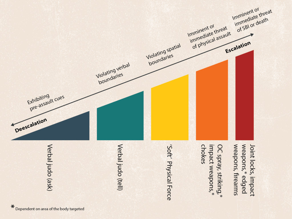 - Note that the height of the segments is meant to represent the level of force each set of options might reasonably constitute, not the likelihood of needing to use them. While the ‘deadly force’ segment of the spectrum is the tallest, it is also the narrowest to reflect the comparative infrequency of lethal threats to those that can be solved with less forceful tools and techniques.