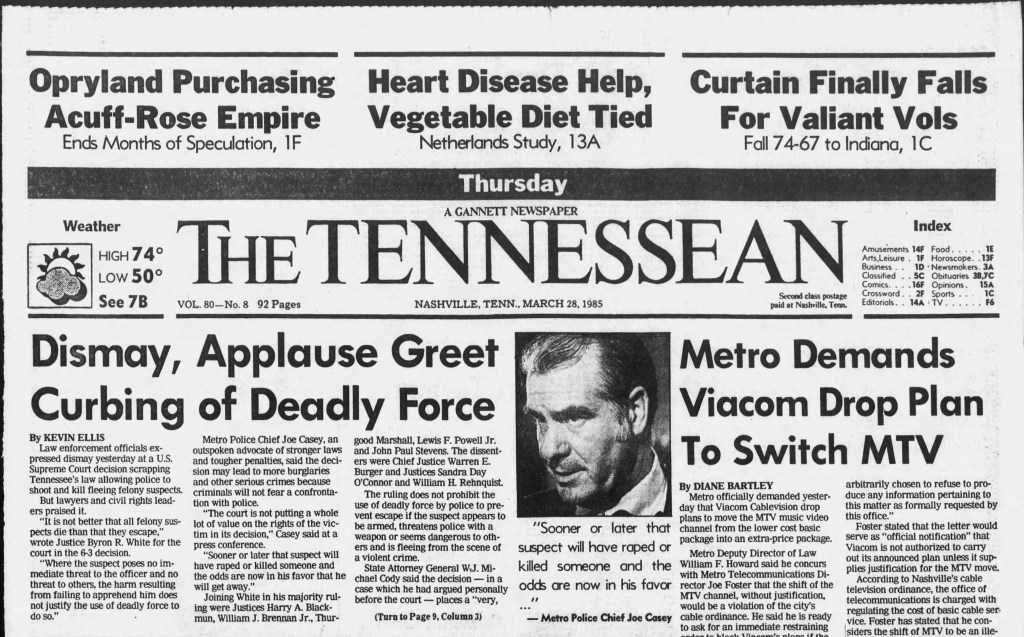 - In 1989, the landmark Supreme Court case Tennessee v. Garner ruled that a police officer can’t use deadly force to stop an unarmed, nonviolent fleeing felon because it violates the 4th Amendment. This might not seem super relevant to us, but bear with me.