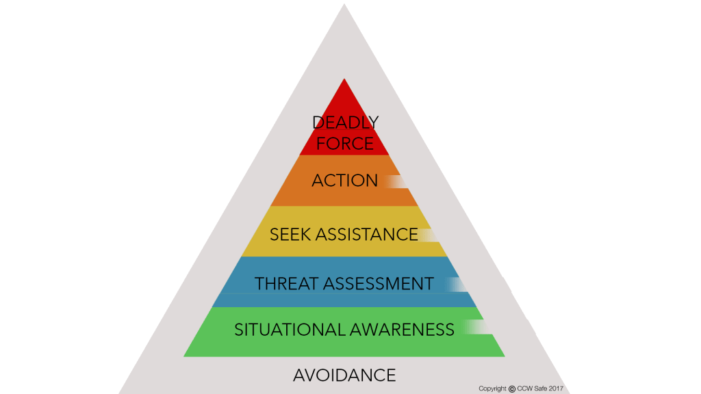 - A ‘menu’ of options that better reflect those available to self-defenders, since most of us don’t have a police canine or TASER in our back pockets.