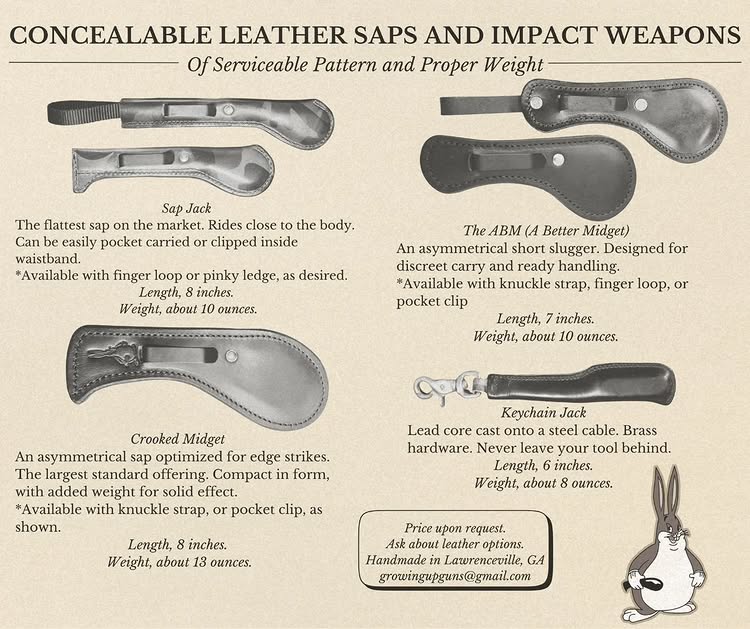 No, this is not a professional interpretation of the law. Yes, saps, slungshots, monkey’s fists, and coshes are technically different than blackjacks. Do I think this would matter to a DA if you cracked someone upside the head with one, even in justified self-defense? No. In fact, I fear it might be considered a deadly weapon per se, meaning one that is understood to be inherently deadly regardless of the manner in which it’s used. Know your local laws and do what you will. I’m not your real dad.